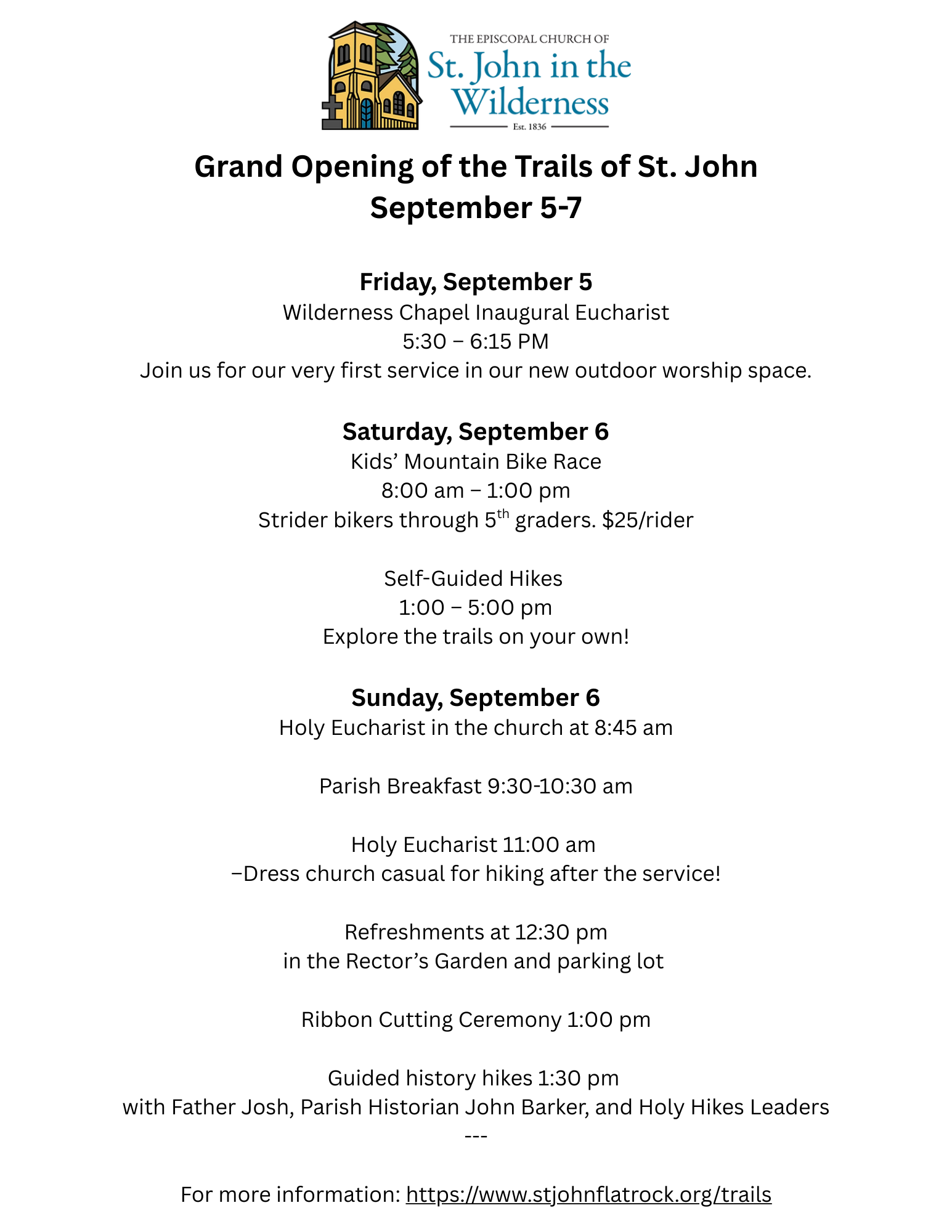 Father Josh often reminds the parish that following Jesus and sharing life in Christian community is “the adventure of a lifetime.” The Trails of St. John now invite people to that adventure in a fresh way, as they discover the holy ground of the church in a modern context. The hope is that neighbors and visitors alike will find rest and renewal through time spent in God’s good creation along these paths.