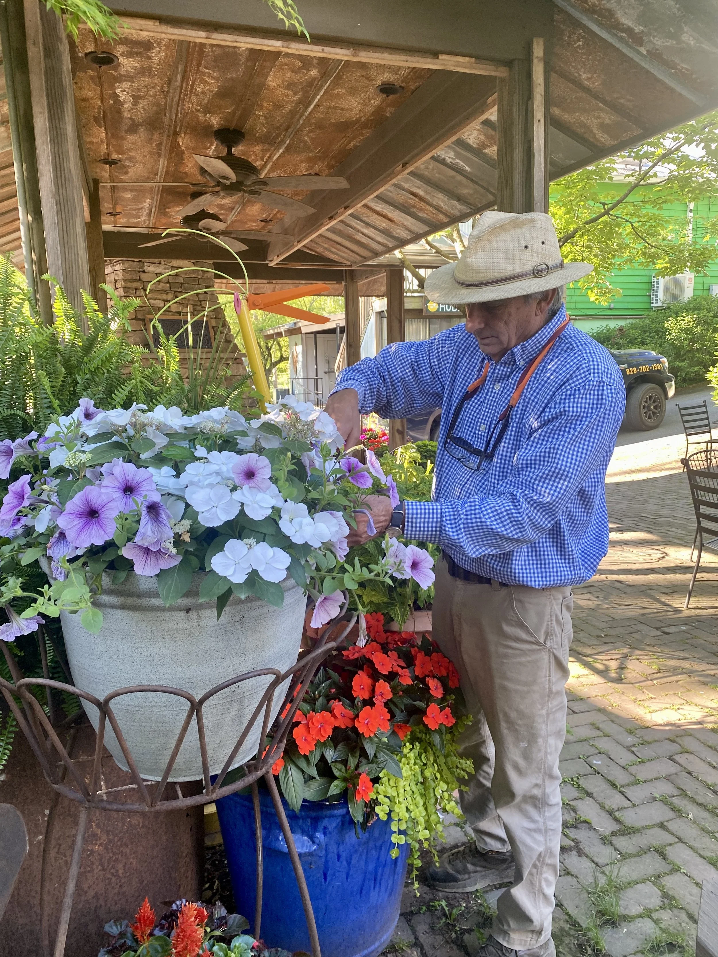 /Starr Teel tending to his flowers at Hubba Hubba Smokehouse