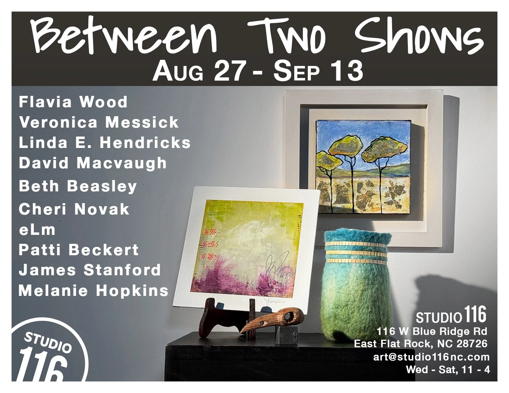 Between Two Shows at Studio 116 – Now through September 13, Studio 116 in East Flat Rock presents Between Two Shows, featuring works by Flavia Wood, Veronica Messick, Linda E. Hendricks, David Macvaugh, Beth Beasley, Cheri Novak, eLm, Patti Beckert, James Stanford, and Melanie Hopkins. Open Wednesday–Saturday, 11 AM–4 PM.