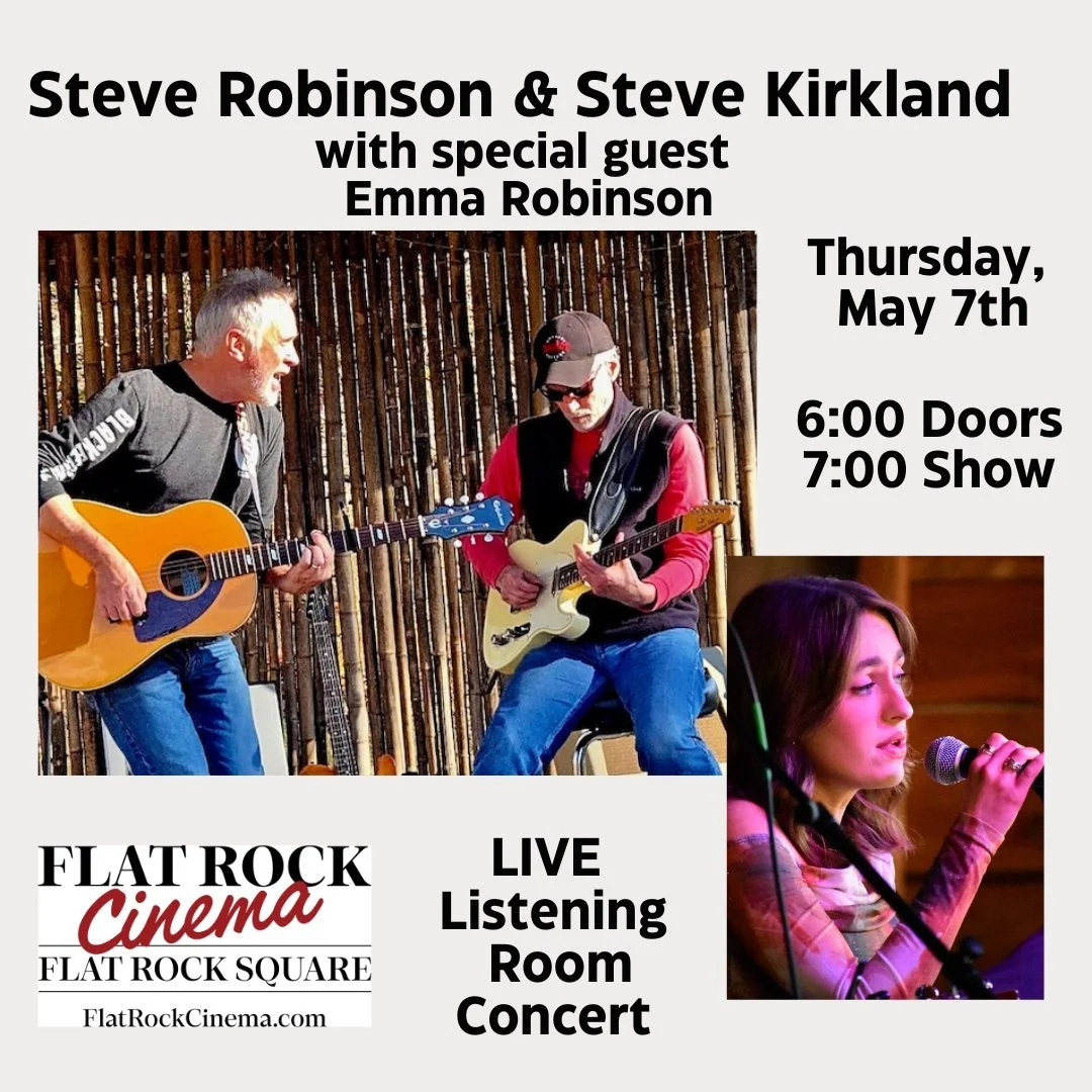 On Thursday, May 7, 2026, at 7:00 p.m., STEVE ROBINSON & STEVE KIRKLAND with Special Guest EMMA ROBINSON will perform in the #ListeningRoom at Flat Rock Cinema.