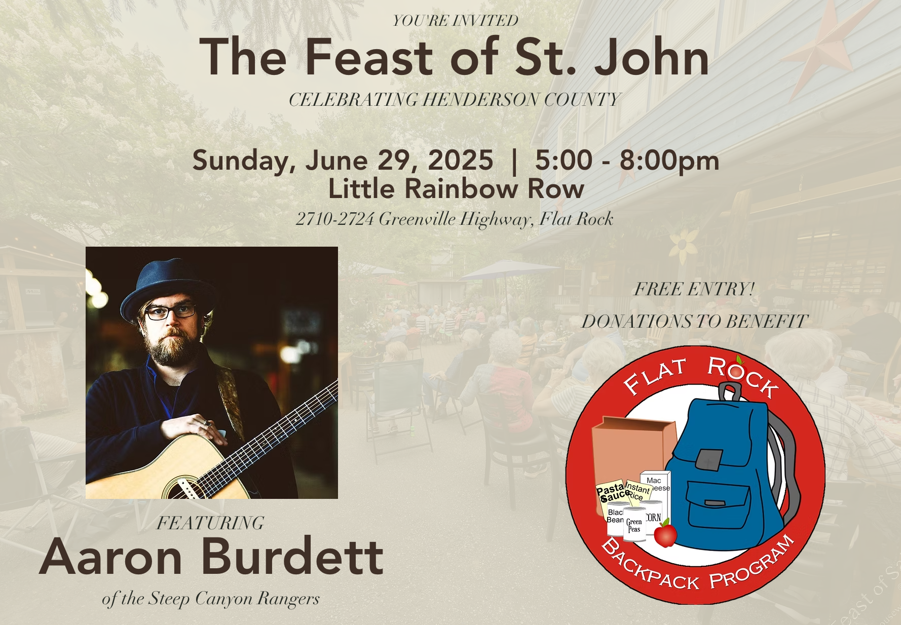 Proceeds from the Feast will benefit the Flat Rock Backpack Program, a ministry that has been feeding school children facing food insecurity in Henderson County since 2008. Admission is free, but donations will be gratefully accepted to support this important work.