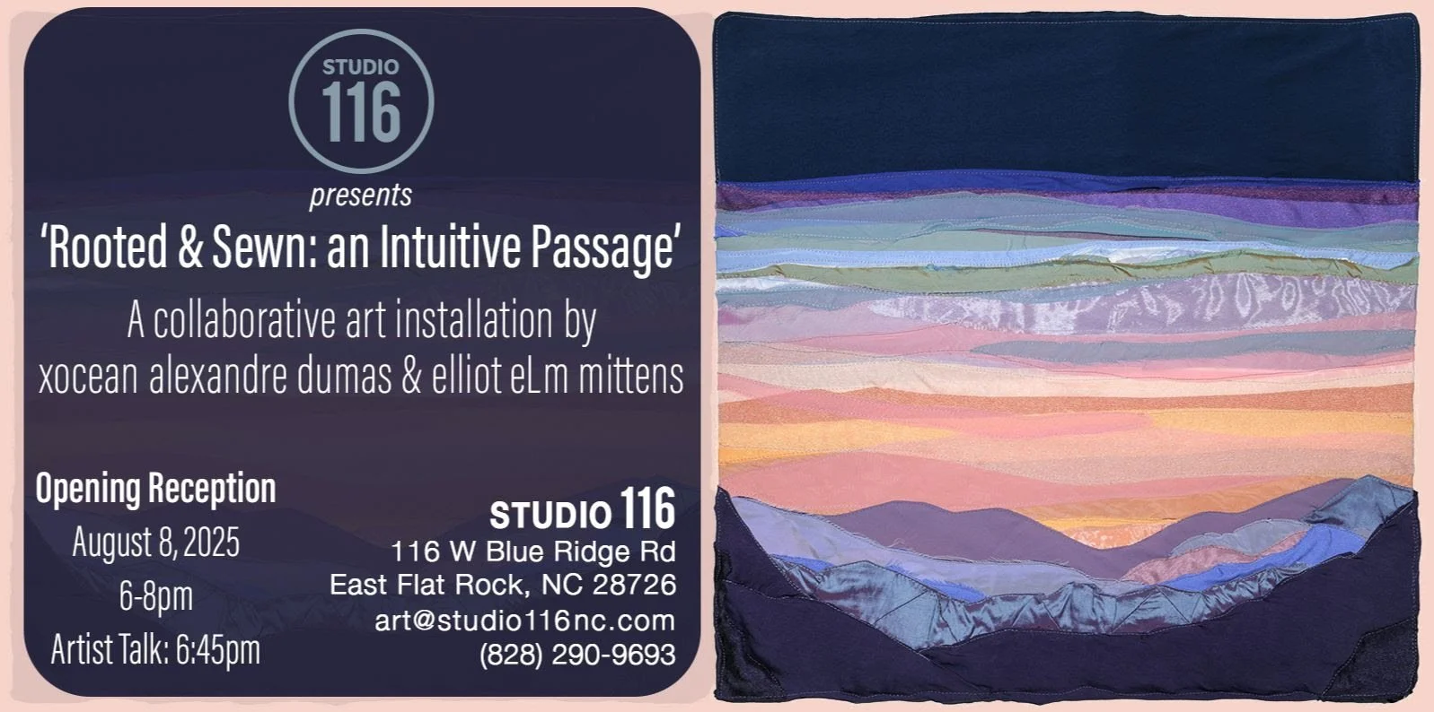 Studio 116 is excited to host ‘Rooted and Sewn: an Intuitive Passage’ an interactive, multi-medium collaborative fiber art installation by creators xocean alexandre dumas and elliot eLm mittens. The exhibit opens on August 8, a date also known since ancient times as the Lion’s Gate, a portal connecting the Earth with the Pleiades.