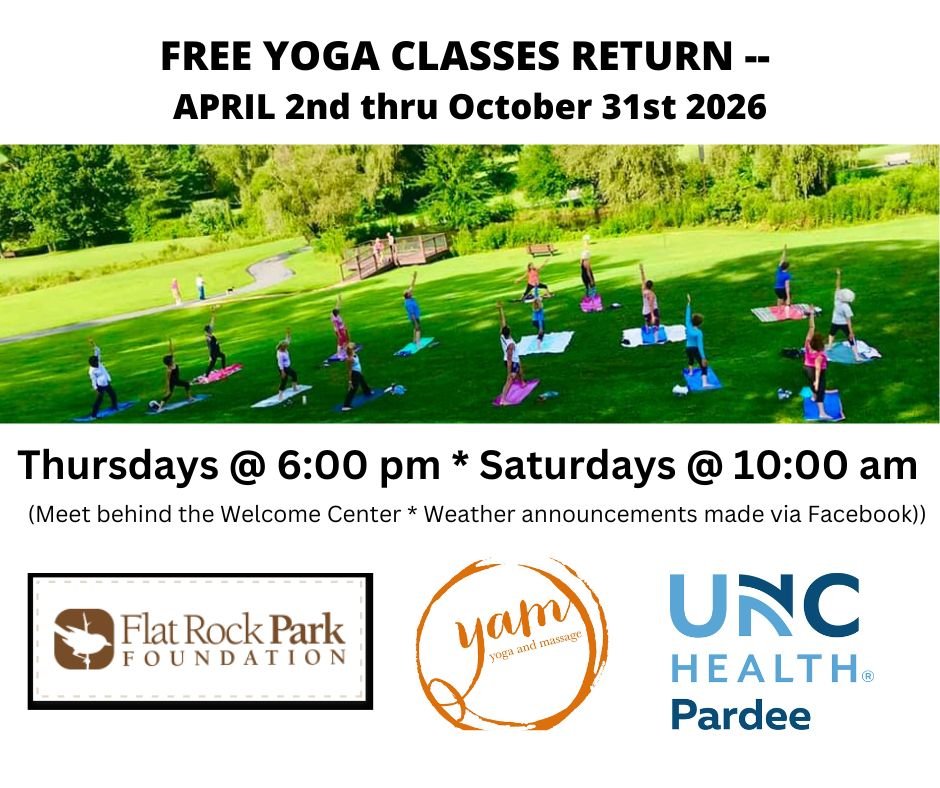 Hosted behind the Welcome Center and supported by the Flat Rock Park Foundation, YAM Yoga, and UNC Health Pardee, these sessions are open to all experience levels. It’s a chance to welcome warmer days, gather in community, and experience The Park as it comes alive with the colors and energy of spring.