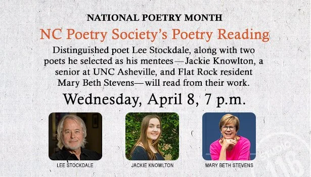 Studio 116 is pleased to announce a special event in honor of April’s National Poetry Month. Distinguished poet Lee Stockdale, and two poets he selected as his mentees—Jackie Knowlton, a senior at UNC Asheville, and Flat Rock resident Mary Beth Stevens—will read from their work. The reading takes place on Wednesday, April 8 at 7:00 p.m.—free of charge with a post-reading reception.