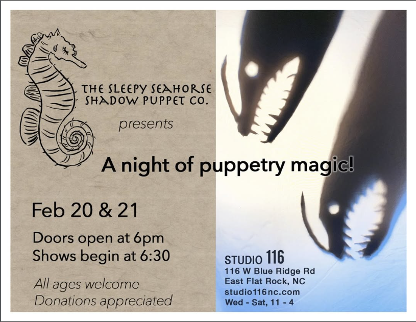 The Henderson County–based Sleepy Seahorse Shadow Puppet Company brings two adapted traditional Japanese folktales to life using handcrafted shadow puppets. This all-ages performance marks the company’s world premiere at Studio 116.