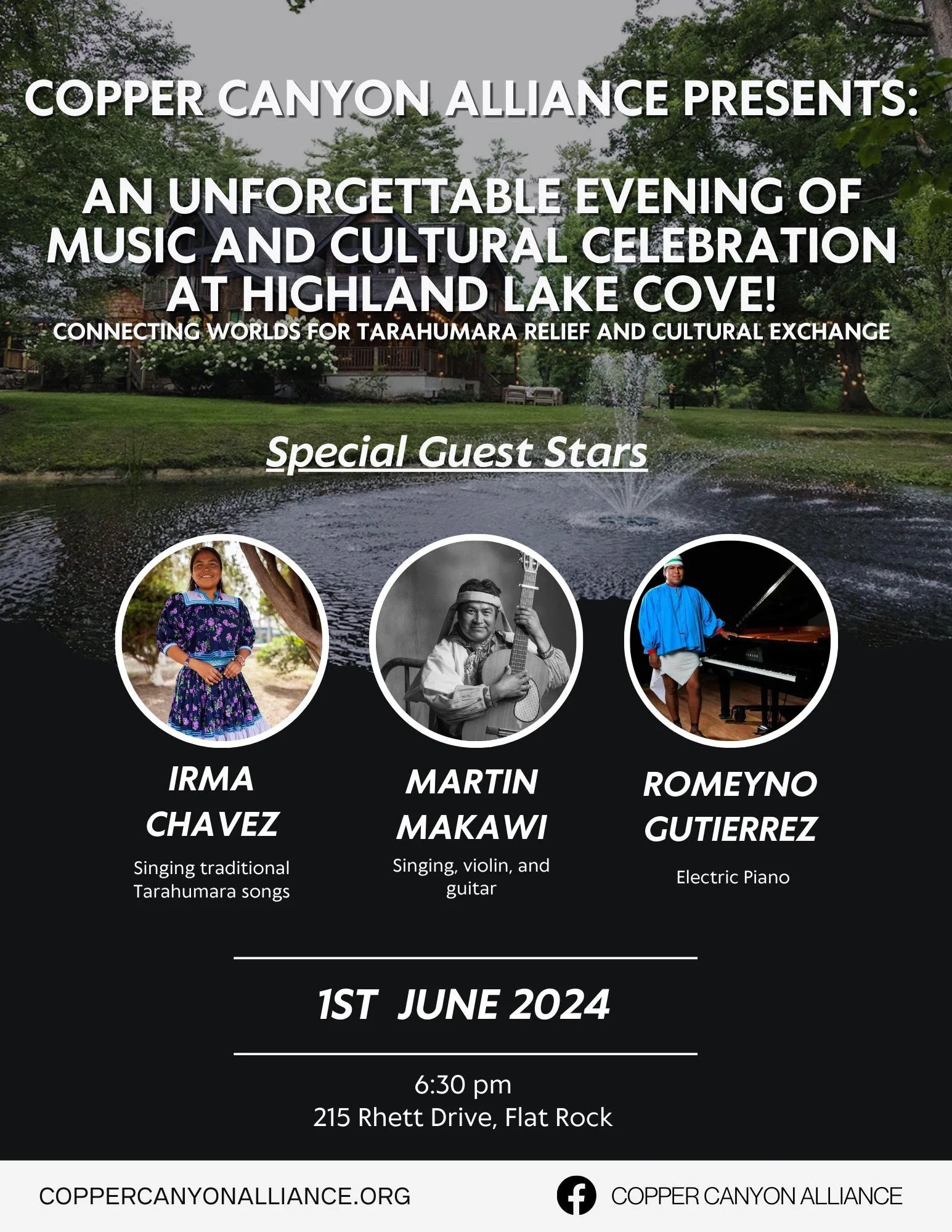 The Tarahumara of Mexico's Copper Canyons will be visiting Western North Carolina at the end of this month. It's a once-in-a-lifetime opportunity to meet and talk with these incredibly talented indigenous leaders. On Saturday, June 1st at 6:30 they will hold a concert of traditional Tarahumara music at Highland Lake Cove, 215 Rhett Drive, Flat Rock. Admission is free and donations will be accepted to help support the people from the deepest and most remote canyons on the continent.