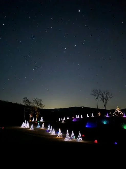 Beginning the day after Thanksgiving, Marked Tree Vineyard celebrates the season with Wine in Winter Wonder — a month-long illuminated holiday experience running November 28th through January 4th. Each evening, the vineyard becomes a modern winter lightscape, with more than 6,000 sparkling lights set against sweeping mountain views and star-bright skies. Guests may drive the loop or stroll the property at their own pace, glass in hand, savoring award-winning Marked Tree wines as they take in the magic. It’s serene, artful, and deeply atmospheric — a holiday outing unlike anything else in WNC.